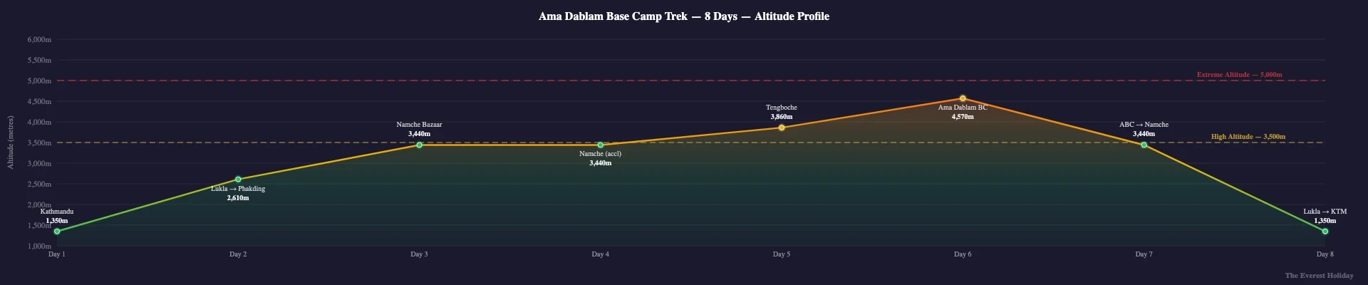 You will walk 4-6 hours a day over mountain trails, reaching a maximum of 4,570m (14,993ft) at Ama Dablam Base Camp. The paths are well-established but uneven, stone steps, river crossings, and steep ascents are part of most days. No previous trekking experience is required, and the lower maximum altitude makes this more accessible than EBC or Gokyo treks. One acclimatisation day at Namche Bazaar helps your body adjust, and our guides monitor your condition throughout.