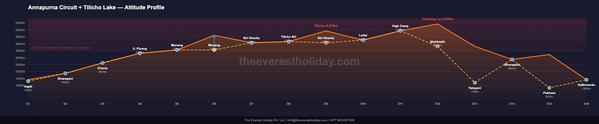 We rate this trek Very Challenging (5 out of 5). That rating reflects the combination of extreme altitude, long trekking days, remote terrain and the double high-altitude exposure that sets this itinerary apart from the standard Circuit. You'll reach 4,919 metres at Tilicho Lake and 5,416 metres at Thorong La, both well above the threshold where altitude sickness becomes a serious concern. The Tilicho trail involves exposed sections along steep scree slopes with significant drop-offs, and the Thorong La crossing starts before dawn with a relentless climb through snow and loose rock. Daily walking ranges from 5 to 8 hours over varied terrain, and the overall distance covered across 16 days demands genuine cardiovascular fitness. Our guides carry a pulse oximeter and monitor your oxygen levels daily. We build the itinerary with a steady altitude gain profile and include acclimatisation time in Manang. We also recommend consulting your doctor about Diamox before departure. If you can comfortably walk 6-8 hours a day on hilly terrain and have done some altitude hiking before, you can do this trek. If you have concerns, read our beginner's guide to Nepal trekking.