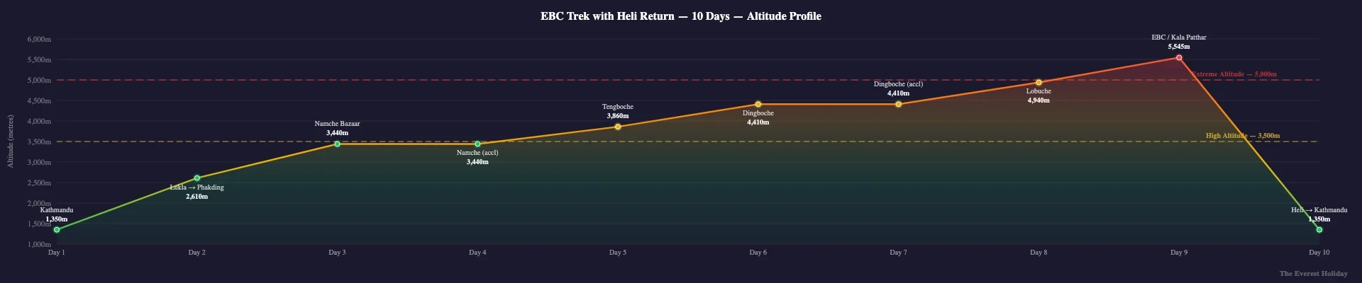 The ten-day itinerary is not easier than the twelve-day classic; the ascent is identical, and the descent to Lukla is compressed. What you gain is time, not reduced difficulty. If you have limited holiday days but solid fitness, this is the route designed for you.