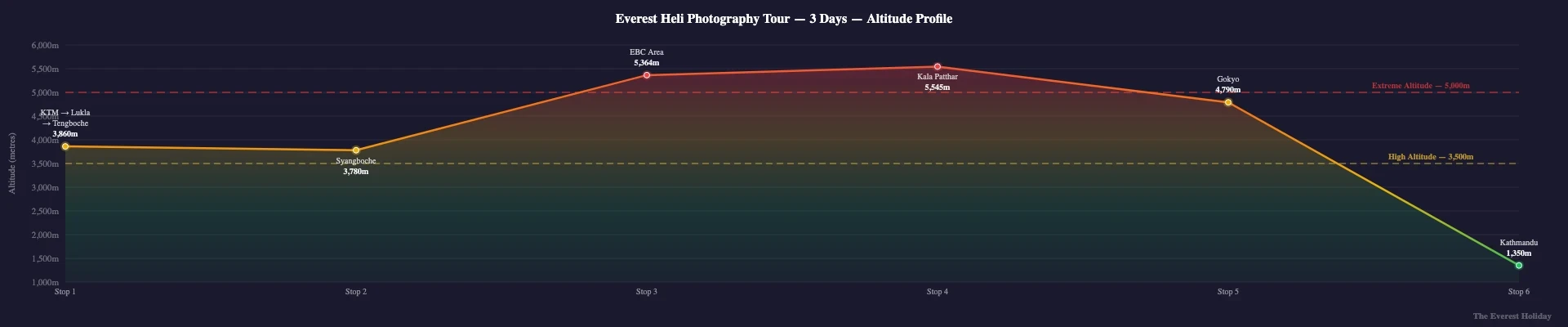 This is a helicopter tour with ground landings, not a trek. No walking fitness is needed beyond the ability to move around landing sites on uneven ground while carrying your camera equipment. The brief exposure to 5,364m altitude is managed by limiting ground time to 15-20 minutes per high-altitude stop. Warm layers are essential at altitude even for short stops. Everyone from hobbyist photographers to professionals can do this tour.