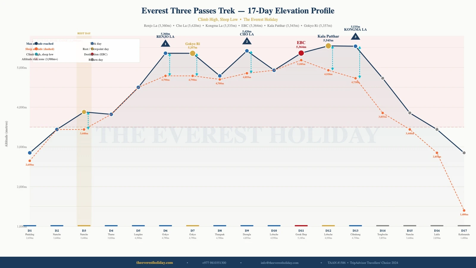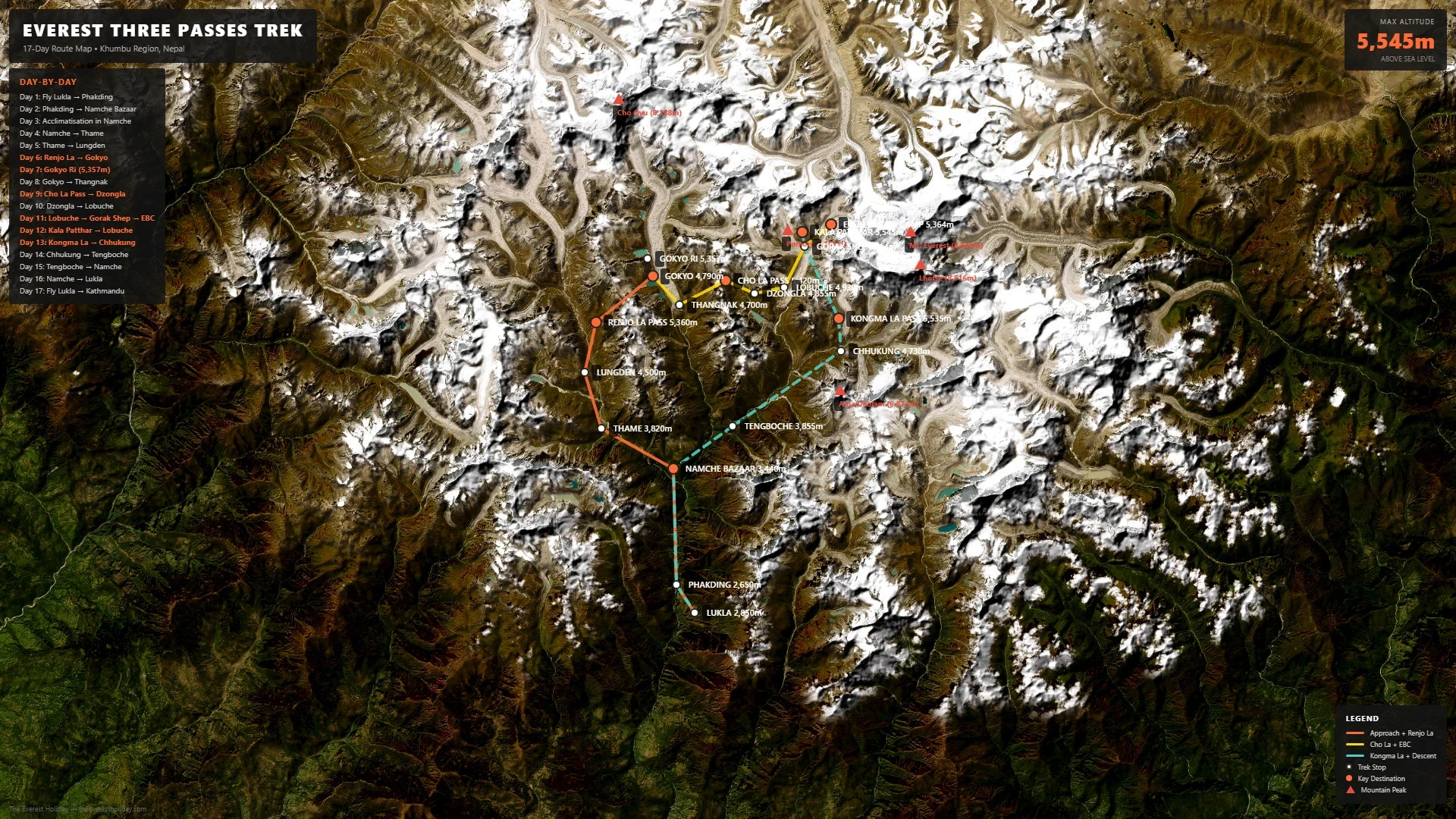 - Cross three glacial passes above 5,300 metres, Renjo La (5,360m), Cho La (5,420m), and Kongma La (5,535m), the most demanding and rewarding high-pass circuit in the Himalayas