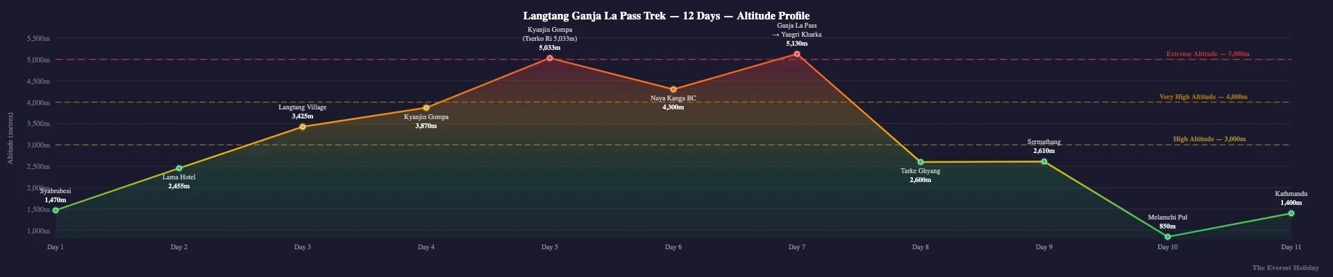 The Langtang Ganja La Pass Trek begins in Syabrubesi (1,460m), follows the familiar Langtang Valley route through bamboo forests and Tamang villages to Kyanjin Gompa (3,870m), then turns south into wild, untrailed terrain to cross the Ganja La at 5,130m before descending through the Hyolmo settlements of Helambu and returning to Kathmandu by road.