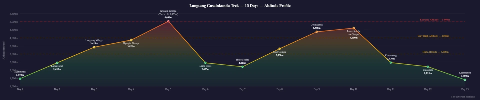 The Langtang Gosainkunda Trek reaches a maximum altitude of 4,380m at Gosaikunda Lake, with an optional day hike to Tserko Ri at 5,033m from Kyanjin Gompa. You walk 5-7 hours per day over 13 days on well-established trails through forests, alpine meadows, village paths, and rocky lake terrain. No technical climbing or ropes. The itinerary includes acclimatisation time in the Langtang Valley before crossing to the higher Gosaikunda basin. Suitable for fit trekkers with some prior hiking experience. The longer duration and two high points make this more demanding than the standard Langtang Valley trek. We recommend 6-8 weeks of cardio and hill walking preparation. Learn more about altitude sickness prevention.