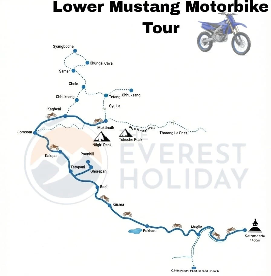 The Lower Mustang Motorbike Tour is a moderately challenging adventure, ideal for riders with basic to intermediate riding experience. Most of the journey follows paved and well-maintained roads, especially between Kathmandu, Pokhara, and Beni. However, there are some rough, dusty, and off-road sections along the Kali Gandaki Valley and around Jomsom and Muktinath, which add excitement to the ride.