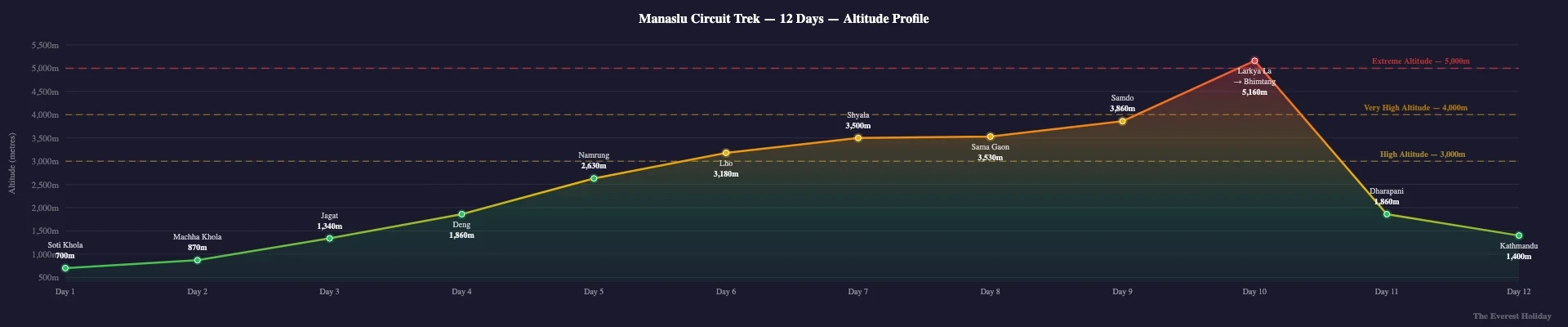 The Manaslu Circuit is a serious mountain trek. You will walk 5 to 8 hours per day over 12 days, gaining altitude steadily from 700 metres at Soti Khola to 5,160 metres at Larkya La. The pass crossing day is the hardest: 8 to 10 hours of walking that starts in freezing darkness, climbs over snow and moraine, and descends steeply through loose rock to Bhimtang. The trail between Jagat and Deng includes narrow sections carved into cliff faces above the river. Altitude sickness is a genuine risk above 4,000 metres. Our guides carry pulse oximeters, monitor your condition daily, and know when to slow the pace or add an extra acclimatisation stop. Previous high-altitude trekking experience is recommended but not mandatory if you are fit, well-prepared and willing to listen to your guide. Travel insurance with helicopter evacuation cover is mandatory.