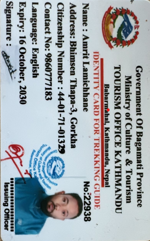 My name is Amrit Lamichhane, and I am from Gorkha village, located between the majestic Manaslu and Ganesh Himal regions of Nepal. I have been working as a trekking guide since 2018, with experience leading treks such as the Manaslu Circuit and Tsum Valley, the Annapurna Circuit with Tilicho Lake, Khopra Danda–Khayer Lake, Upper Mustang, Gosaikunda–Langtang Valley, and Annapurna Base Camp via Ghorepani Poon Hill and Ghandruk.