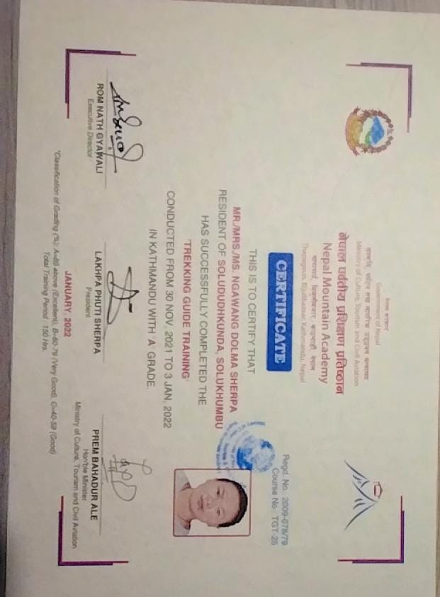 My name is Ngawang Dolma Sherpa, a trained and experienced trekking guide from Solududhakunda-2, Phera, Solukhumbu, Nepal.
