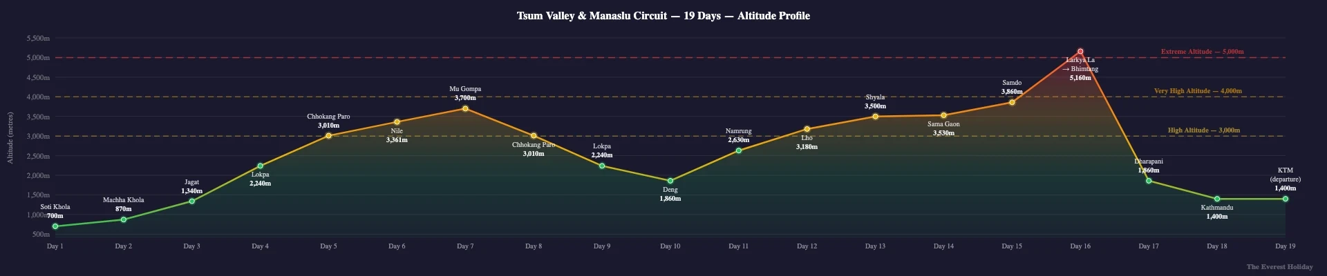 The itinerary builds in acclimatisation naturally. The Tsum Valley detour keeps you at moderate altitude (3,000-3,700m) for several days, giving your body time to adjust before you push above 4,000m on the main circuit. By the time you reach Samdo and face the Larkya La crossing, you have had more acclimatisation time than trekkers doing the standard 12-day circuit. This makes the 19-day itinerary both more comprehensive and safer.
